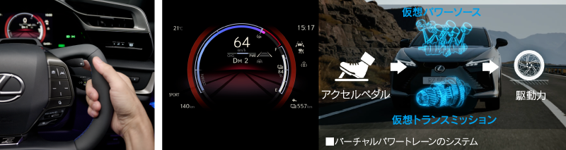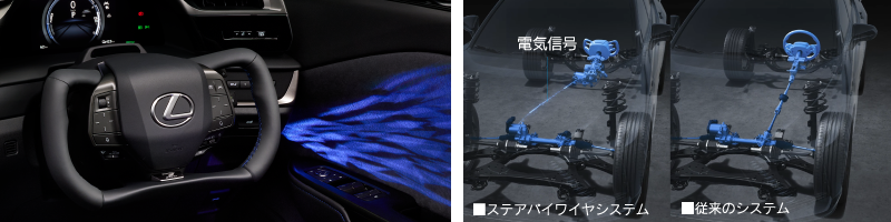 レクサスが大切にしている「人とクルマとの対話」をより加速させ、コックピットのあり方に大きな変革をもたらす機能「ステアバイワイヤシステム」。電気信号によるタイヤの動きの制御、異形ステアリングがもたらすダイレクトな操舵感、DIRECT4の高応答・高精度な駆動コントロールの組み合わせが、ドライバーの操作とクルマの挙動がよりシンクロしたドライビング体験を提供します。